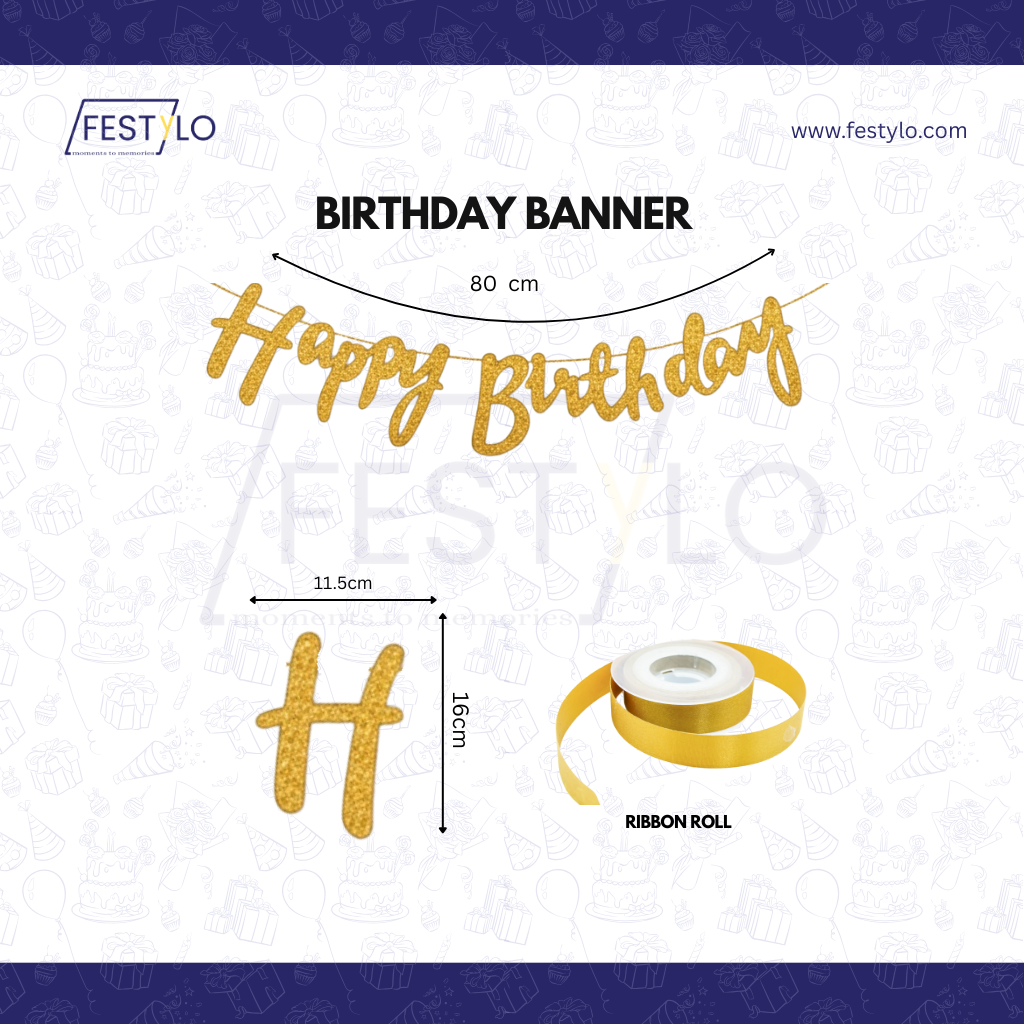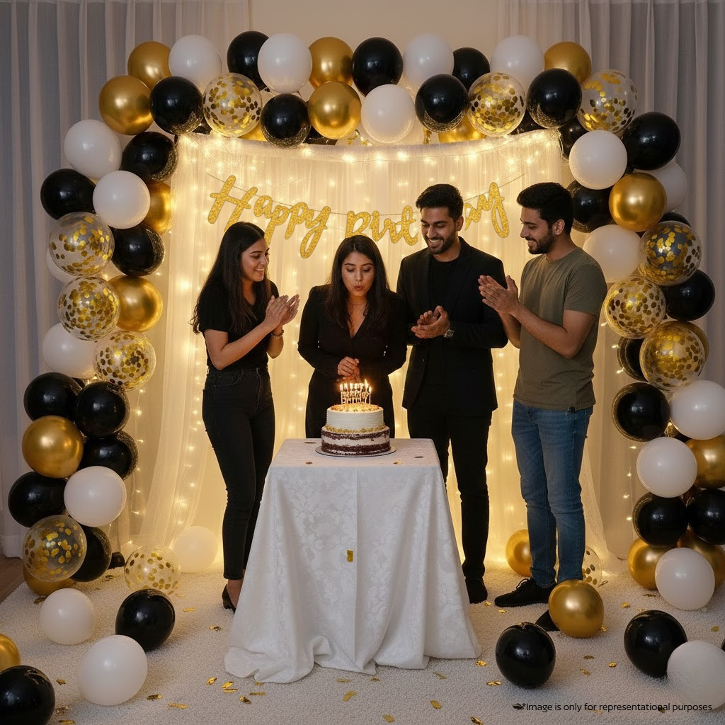 Create a premium birthday decoration setup with the FESTYLO Birthday Decoration Combo (40 Pieces). This stylish black, white and golden theme décor kit is perfect for room decoration, home party, surprise decoration, kids birthday, adults birthday and hotel room setup.