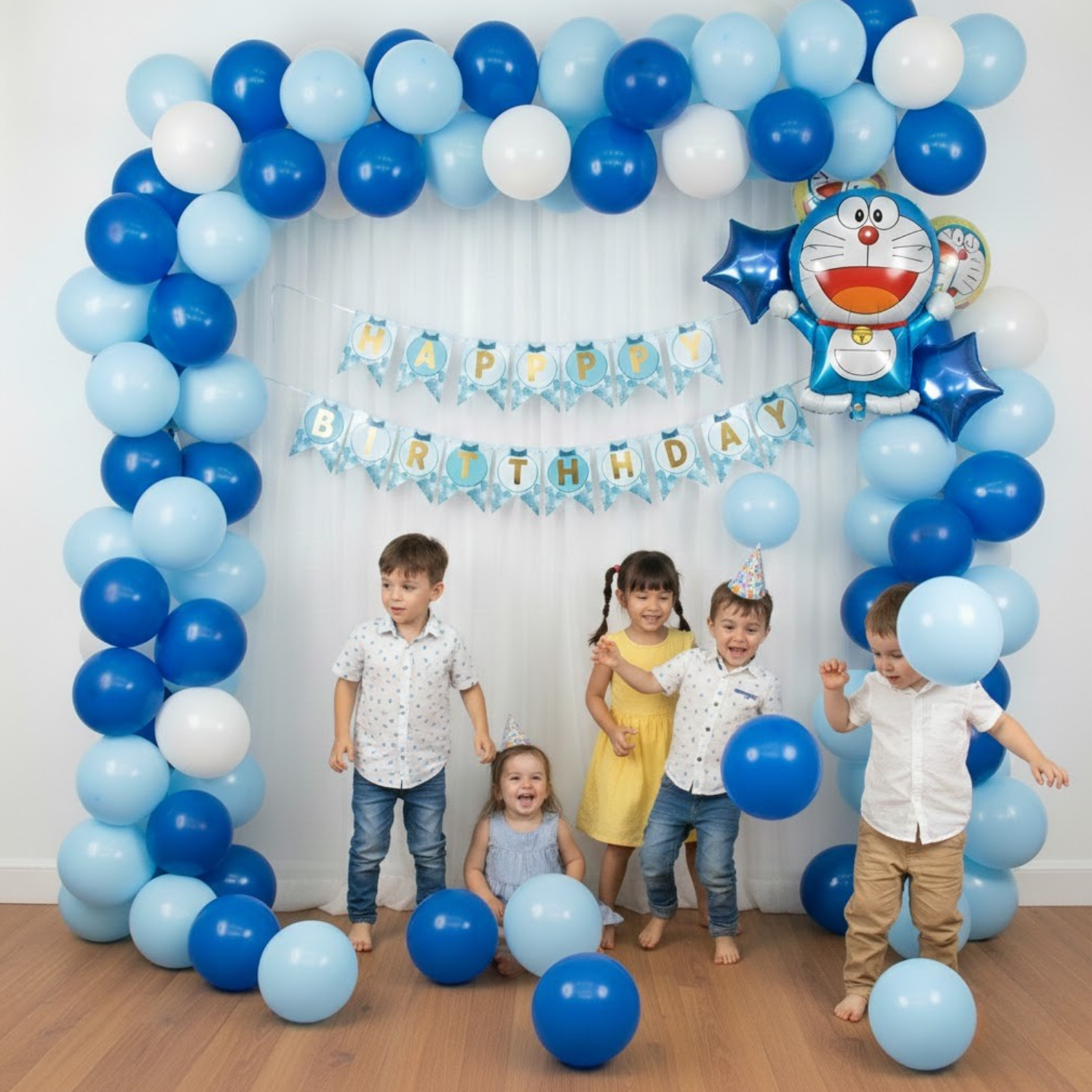 Create a fun-filled and vibrant birthday celebration with this premium Doraemon Blue Balloon Arch Birthday Decoration Combo. Designed in an attractive mix of pastel blue, dark blue, and white balloons, this combo helps you build a professional balloon arch backdrop at home.