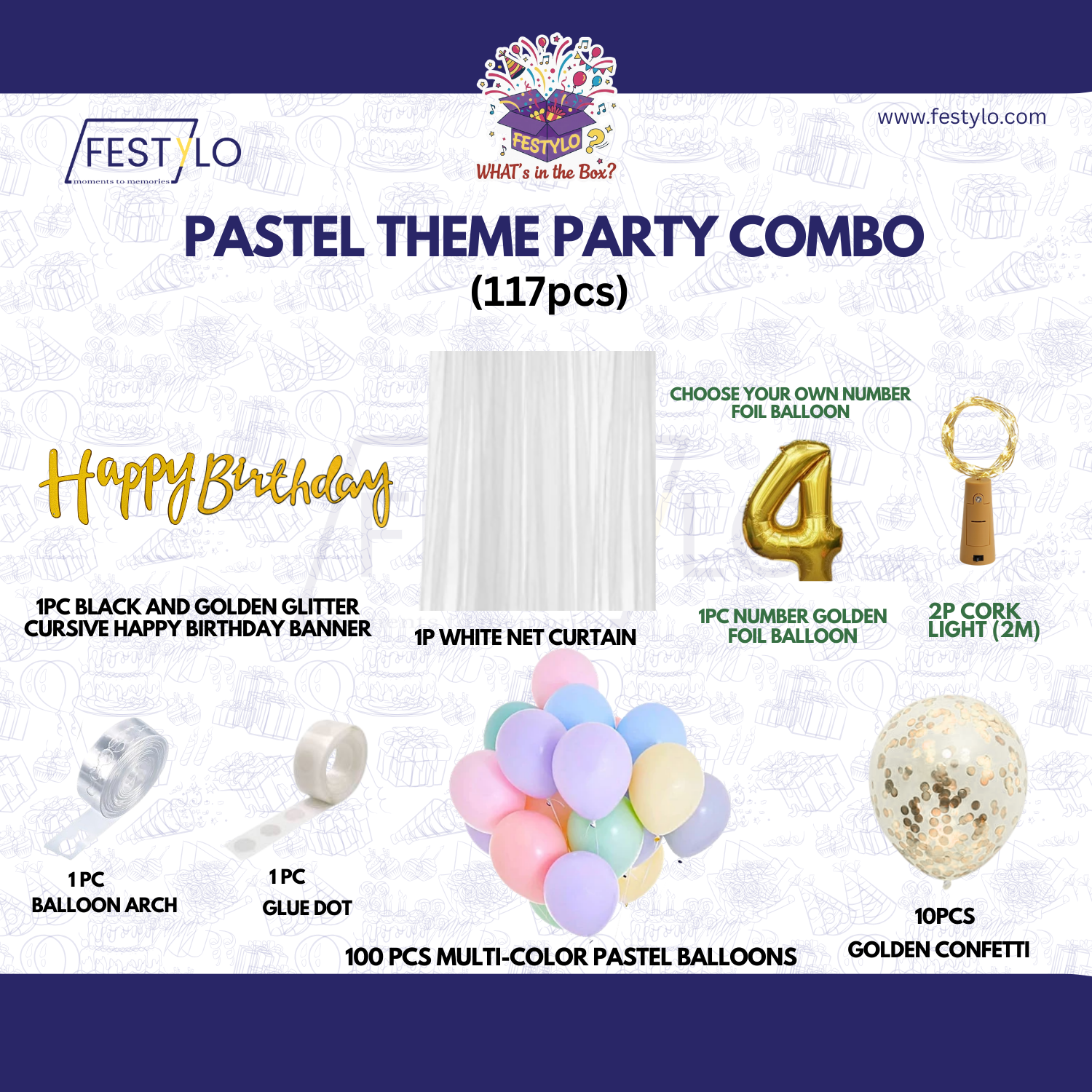 Soft pastel balloons combined with silver confetti, warm cork lights, and a customizable golden number foil balloon make your celebration elegant and memorable. Whether it’s a 1st birthday or any age milestone, this combo is designed to transform your party space instantly.