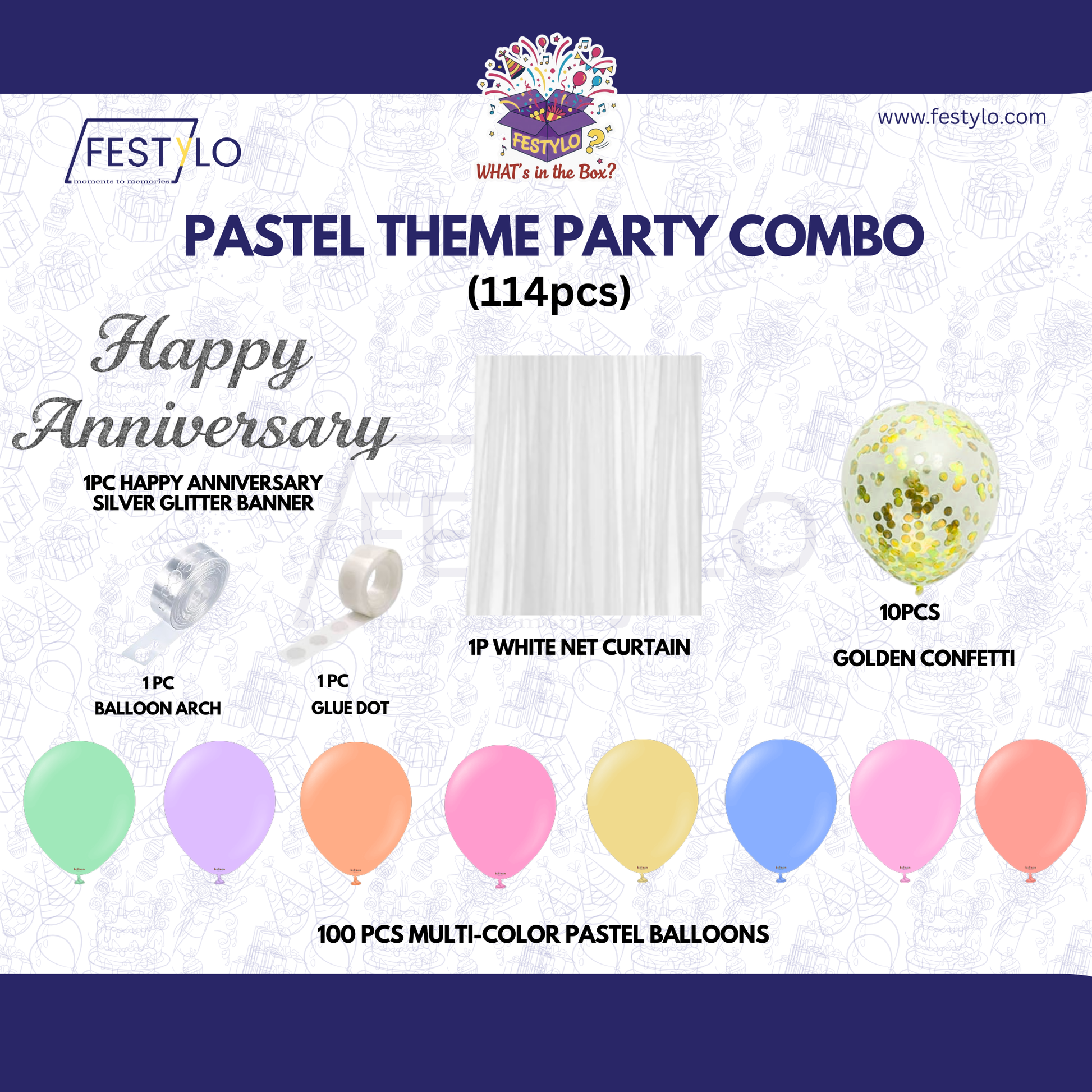 Make your special day unforgettable with our elegant Pastel Theme Party Combo Decoration Kit (114 pcs) by Festylo. Designed especially for Anniversary Celebrations, this premium pastel balloon arch kit creates a soft, romantic, and Instagram-worthy backdrop for your big day.